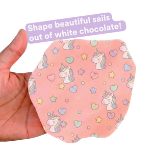 Note: These sheets work best if applied onto a thin layer of white chocolate. So if you use dark chocolate we recommend applying a thin layer of white chocolate (onto which you apply the printed Miracle Transfer Sheet) onto the dark chocolate.